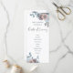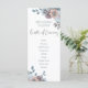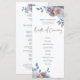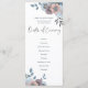Este elegante design tem belas ilustrações florais simplistas em azul empoeirado e cor-de-rosa salmão dos cantos superior direito e inferior esquerdo na frente, e um movimento floral coordenador no topo na parte de trás. O cabeçalho principal Order of Ceremony está em um script preto de conjunto de na moda e o restante do texto na frente e atrás pode ser facilmente personalizado para seus próprios detalhes. Você também pode alterar as cores de texto editáveis, se desejar, por meio da opção de personalização adicional.