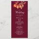 Este cartão de programa de casamento de outono elegante apresenta um fundo borgonha profundo com folhas de outono em aquarela em vermelho rico, laranja e dourado. O layout vertical torna fácil exibir os detalhes da cerimônia, leituras e seleções de música em um formato claro e clássico. Perfeito para casamentos de setembro, outubro ou novembro com um tema romântico, rústico ou sazonal.