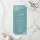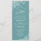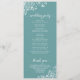 Este belo programa de casamento apresenta um elegante design com texto branco sobre um chalé, turquesa, ou fundo de cor aqua, e coalhada branca e ondulada e espirais nos cantos. Os títulos são escritos em caligrafia de rico, e há espaço para seus detalhes de cerimônia e festa de casamento, assim como um obrigado curto para seus convidados. É uma maneira maravilhosa de dar as boas-vindas aos seus amigos e familiares à sua celebração de casamento.