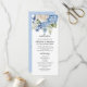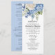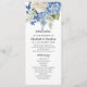 Design de casamento floral elegante com arranjos florais pintados a aquarelas de flores azuis de hydrangea, verde e rosas brancas.