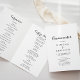 Este programa de casamento dobrado em espanhol é perfeito para um casamento moderno. O design simples e elegante apresenta a tipografia de scripts clássicos e ricos em preto e branco. Inclua uma citação ou mensagem curta, ordem de serviço, festa de casamento e obrigado da mensagem.