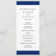 Programa moderno de casamento azul marinho com uma banda ousada no topo e no fundo. Seus nomes estão em uma fonte serif clássica e seus detalhes estão em uma combinação de uma fonte sans serif moderna e um script elegante. A parte de trás tem uma banda ao longo do fundo junto com o seu monograma. Esta simples e mínima design com a redação tradicional é excelente para um casamento formal.