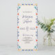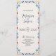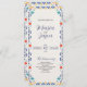 Este design vertical do Programa de Casamento Estético Floral da Talavera Majolica Mexicana apresenta uma fronteira alegre e festiva com os motivos florais folclóricos em tons vibrantes de vermelho, laranja, amarelo, turquesa e marinho azul, colocados contra um fundo creme quente e de textura leve. A fronteira é delicadamente detalhada com flores estilizadas, padrões de fãs e sotaques ornamentais curvos, dando-lhe uma aparência pintada e artesanal. O espaço central do vazio fornece uma canvas limpa e convidativa, fazer ideal para programas de eventos, cartões de menu ou anúncios de celebração com talento cultural ou artístico.