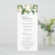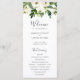 Elegante programa de casamento floral com rosas brancas pintadas a aquarelas e verde pintadas à mão juntamente com "Bem-vindo" em um lindo roteiro manuscrito. O lado da frente tem sua ordem de cerimônia e o verso tem sua festa de casamento e obrigado.
