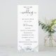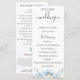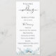 Flores e folhagens de aquarela azul empoeirado, programa de casamento. O programa apresenta caligrafia fofa de "casamento" com várias linhas para listas de texto personalizadas para a ordem dos eventos da cerimônia, festa de casamento e nota de agradecimento.