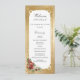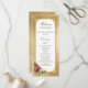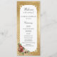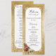 Crie um casamento no inverno inesquecível com este elegante design do programa de férias, com um spray de pelúcia de rosas de Natal, poinsettia, colly e pinheiro, etiqueta branca com uma borda de ouro ornamentado e um fundo metálico de cor damasco de ouro metálico falso opulente.