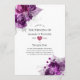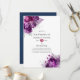 Rosas roxas de ameixa escura e programa de casamento de folhagem tropical com brilho prateado com coração colorido de framboesa e lavagem de marinho azul-aquarela inversa.