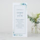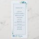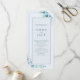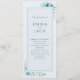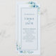 Este elegante programa de casamento apresenta um layout limpo e moderno com delicados sotaques botânicos azuis. Flores moles, ao estilo aquarela, e molduras verdes folhadas, tanto no topo como no fundo do cartão, criando uma sensação fresca e natural. O design minimalista usa uma fonte serif refinada em azul suave, aprimorando o olhar contemporâneo e sofisticado. Perfeito para os casal que buscam um programa de casamento na moda, mas subestimado, este cartão de face dupla exibe a ordem da cerimônia e os detalhes da festa de casamento em um formato fácil de ler. A legal paleta de cores azul e verde, aliada a sutis ilustrações florais, traz um senso de calma e elegância - ideal para primavera, jardim ou casamentos ao ar livre.