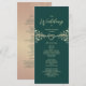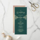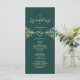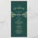 Programa de casamento elegante em verde esmeralda e dourado com detalhes florais e um acento romântico em forma de coração com corda. Perfeito para guiar os convidados através da ordem da cerimônia em casamentos elegantes, formais, de outono ou inverno. Personalize com seus nomes, data e detalhes personalizados da cerimônia para um toque único. Combina perfeitamente com convites, menus, placas e papelaria em esmeralda e dourado da mesma coleção de casamento.