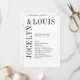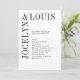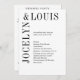 Programa moderno de casamento, com um design preto e branco minimalista com seus nomes em uma fonte grande ao lado esquerdo e superior. Esta design é simples o suficiente para um casamento formal, mas faz uma declaração ousada.
