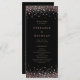 Esses programas de casamento personalizáveis apresentam pontos falsos de confete de folha de ouro rosa num fundo preto. Eles são perfeitos para compartilhar seus detalhes da cerimônia de casamento com seus convidados e são perfeitos para qualquer tema ou estação de casamento. Personalize adicionando seus detalhes. Itens correspondentes estão disponíveis.