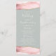 Este elegante e moderno programa de casamento apresenta cor d'água rosa pincelada agata bordas superiores e inferiores aparadas com brilho dourado. O texto aparece em letras brancas elegantes e fontes em cores em um fundo verde-sábio pálido.