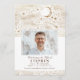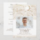 Design um programa de funeral com tema celeste adaptado a um stargazer que foi capturado pelo céu noturno e por galáxias distantes. A frente deste cartão apresenta uma fotografia amada, o nome do indivíduo e as datas de nascimento e morte. O verso é para a "Ordem de Serviço", detalhando meticulosamente cada evento.