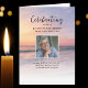 Uma bela comemoração do programa de funeral de vida com uma foto de um pôr do sol numa praia (ou substitua por sua própria foto). Adicione fotos do seu amado e texto personalizado a todos os quatro lados - um obituário, ordem do serviço, poema, obrigado da sua mensagem, etc. Este programa é tão fácil de personalizar - basta clicar em "personalizar este modelo" para alterar o texto e as fotos ou clicar em editar para personalizar ainda mais. Este é, de fato, um programa de um tipo que as pessoas irão apreciar para sempre.