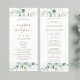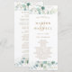 Este programa de casamento apresenta cores aquáticas pintadas de eucalipto, folhas botânicas verdes e douradas com guião dourado.