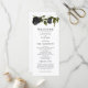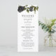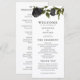 Programa de casamento gótico com ilustração de rosas pretas em fundo branco. Todas as informações da cerimônia de casamento e o nome da festa de casamento listados neste programa. Perfeito para um casamento de halloween.
