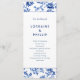 Este programa de casamento de eternos apresenta um clássico design floral azul e branco inspirado nos padrões tradicionais da chinoiserie. As ilustrações botânicas azuis deliciosas apresentam a parte superior e inferior da placa, criando uma borda refinada e elegante. O fundo branco limpo e a fonte serif moderna garantem que os detalhes e a festa de casamento da sua cerimônia sejam fáceis de ler e apresentados de forma elegante. O lado frontal destaca os nomes do casal, junto com uma clara ordem de cerimônia. O reverso lista a festa de casamento do cheio, incluindo oficial, pais, madrinha de casamento, melhor homem, damas de honra, padrinhos de casamento, florista e portadora de anéis. Um obrigado sincero que a mensagem do casal acrescenta um toque pessoal. Este cartão de lado duplo é ideal para casamentos formais, clássicos ou de jardim, oferecendo um olhar sofisticado e gracioso.