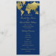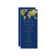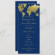 A Elegante viagens vintage da cerimônia de núpcias inspirada pela Elegant design apresenta um mapa mundial de design com uma aparência de um shimmer de ouro de champanhe. Personalize o texto personalizado com o nome da noiva e noiva, data do casamento, informações da cerimônia, festa noiva e mensagem de obrigado. A cor azul do marinho pode ser modificada.