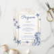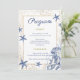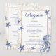 Guide your guests through your celebration with this elegant coastal themed wedding program card. This double-sided design features delicate dusty blue watercolor starfish and subtle gold sea kelp illustrations, framed by a chic gold geometric border. Perfect for a coastal, or beach-themed wedding. This custom ceremony program adds a beautiful, sophisticated touch to your seating area and serves as a lovely keepsake for your guests.