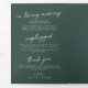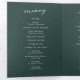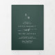 Este programa de casamento de monograma verde-esmeralda boho é perfeito para um casamento minimalista. O design verde boêmico moderno da floresta de caçadores de escuros e modernos apresenta uma caligrafia rústica simples com um estilo único, porém clássico. Personalize seu programa de casamento com suas iniciais, nomes, data e local do casamento, sua citação ou letra favorita, ordem de serviço, festa de casamento, em uma mensagem memorial amorosa, mensagem de cerimônia desconectada, uma nota de agradecimento e uma foto.