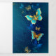 Ouro voador, borboleta de joias em fundo textural azul. Design com borboletas.