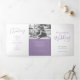 Texto simples e pequeno programa de casamento de coração branco com suas próprias duas fotos, história de amor, a ordem da cerimônia, festa de casamento e obrigado que você escolhe. Personalize este triplo programa de casamento mono roxo e branco com seus próprios nomes e detalhes da cerimônia de casamento. Outras cores e itens de casamento correspondentes disponíveis. © Design por Sarah Trett para www.mylittleedenweddings.com no Zazzle.