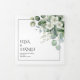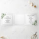 Ramos de Eycalyptus com flores brancas, com o programa Tri-Fold de casamento floral. Apresenta ramos de eucalipto adornados com flores brancas e verde, incorporando um tema elegante de primavera. A design apresenta galhos com flores brancas e folhas verdes sábias nos cantos, enquanto o centro interior exibe uma fotografia de casal. Os nomes são apresentados em tipografia decorativa, e cada painel é enquadrado com bordas finas e pretas.