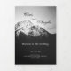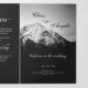 Casamento preto e branco debaixo das montanhas. Fotografia paisagística de uma montanha coberta de neve com escuridão abaixo e céu branco nublado acima. Os nomes do casal estão em caracteres pretos acima da montanha no céu e todos os detalhes estão em caracteres brancos abaixo da montanha. Produtos de casamento totalmente personalizáveis e personalizáveis.