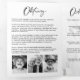 Honra e lembre-se do seu amado com este elegante programa de funeral triplo. Este programa maravilhosamente desenhado é a forma perfeita de comemorar uma vida bem vivida e compartilhar memórias de preciosos com a família e amigos durante uma celebração do serviço de vida. O layout triplo oferece amplo espaço para conteúdo personalizado, garantindo um tributo adequado. O clássico fundo branco com a escrita negra adiciona um toque de sofisticação e respeito. Cada seção do programa pode ser adaptada às suas necessidades. O cobrir do programa exude elegância e reverência, definindo perfeitamente o tom para uma celebração sincera da vida. O cobrir apresenta uma fotografia grande e radiante dos que partiram, capturando seu calor e espírito. O título "Celebrando a Vida de [Nome]" é escrito em um roteiro gracioso e uma fonte simples e moderna, acrescentando um toque pessoal. Abaixo, as datas de nascimento e de passagem são mostradas sutilmente, fornecendo um detalhe simples mas significativo. A design geral do cobrir é digna e convidativa, fazer que seja um belo guardião para que a família e os amigos apreciem. Os painéis internos apresentam um obituário sincero, a ordem de serviço e uma leitura especial. Mostra momentos apreciados com espaço para múltiplas fotos. A design permite uma apresentação significativa da vida de seu ente querido, capturando sua essência e seu legado. O painel traseiro inclui uma colagem de fotos, reconhecimentos e sentimentos finais, fornecendo um adeus completo e respeitoso. Feito com atenção aos detalhes, este triplo programa funerário ajuda-o a criar um tributo memorável e digno, honrando a vida e o legado do seu amado.