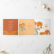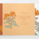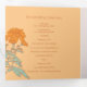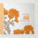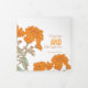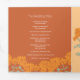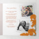 Desenho gráfico botânico de flores laranja crisântemo com folhas verdes em um programa personalizado de casamento quadrado. Personalize com o nome de sua própria noiva e noiva e a data do casamento, cerimônia de casamento, história de amor, festa de casamento e obrigado, além de três de suas próprias fotos, um centro de página de cheio e duas na sua página de história de casamento. Perfeito para um casamento cor de laranja. Design apresenta um impressão de desenho gráfico de flores crisântemas por Sarah Trett para www.mylittleedenweddings.com somente disponível no zazzle.