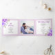 Flores de aquarela roxas Foto floral lilac Programa de Casamentos Triplos. Ele apresenta buquês de flores em tons de roxo e azul nos cantos enquanto seu texto é colocado em quadros brancos com bordas liláticas. Há uma foto no meio da dentro.