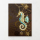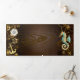 Fundo de madeira castanho com fundo marinho, cordilheira mecânica, volante antigo, âncora de ouro e diversas engrenagens de ouro e latão. Estilo Steampunk.