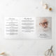 This beautiful printed celebration of life program features a warm, modern design with ample space for personalized content and photo memories. The cover showcases a full-size portrait of your loved one with soft background lighting and elegant black script for name and memorial dates. Inside, the tri-fold layout includes clearly organized sections for the order of service, acknowledgments, obituary, and a heartfelt poem, prayer or quote. A dedicated photo collage panel allows you to highlight six favorite images, creating a deeply personal and visual tribute. Clean white backgrounds and professional serif and handwritten script fonts ensure readability and sophistication throughout. Ideal for memorial services, funerals, or celebration of life ceremonies, this program is both a service guide and a treasured keepsake. Whether displayed during the event or saved by family and guests, this printed design helps preserve cherished memories and honor a life with dignity and heartfelt beauty.