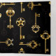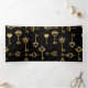 Padrão perfeito de chaves antigas, douradas e silhuetas em fundo preto.