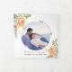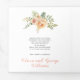 Pêssegos, flores aquáticas, folhas verdes e fotos do programa de casamento Tri-Fold. Um bonito design que mostra uma foto, flores de cacto de coral de pêssego e folhas suculentas no canto superior esquerdo e inferior direito, o texto "O casamento de" em preto e pêssego-coral, seus nomes e data do casamento e um coração rosa no cobrir. Há outra foto no painel de trás, enquanto os outros painéis incluem os detalhes de sua cerimônia e festa de casamento.