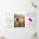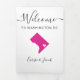 Bem-vindos convidados ao seu casamento com esta carta tripla. Há muito espaço para incluir seu itinerário, sugestões de restaurantes, coisas para fazer e informações de contato. Há espaço para uma foto na parte de trás da carta. Todo o texto pode ser personalizado, incluindo o título. Você pode editar as cores de qualquer parte desta design, assim como mover o coração para o local do seu casamento. Para alterar as cores, clique em personalizar e, em seguida, "editar usando a ferramenta design." Selecione o elemento que deseja editar e, em seguida, use as ferramentas para fazer as alterações.