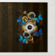 Composição do relógio de aço redondo com discagem numérica romana preta, decorado com engrenagens de ouro e latão, borboletas morfo azuis e lentes danificadas sobre fundo listrado castanho. Estilo Steampunk.