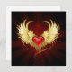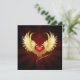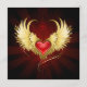 Coração vermelho brilhante de um anjo com asas ouros brilhando no fundo vermelho-radiante escuro decorado com um padrão.