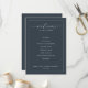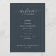 Este elegante programa de casamento apresenta um fundo azul-navy profundo com um design minimalista que enfatiza a tipografia. O layout é limpo e estruturado, apresentando o cronograma da cerimônia em um formato centralizado e fácil de ler. Uma mistura de fontes cursivas e serifadas adiciona um toque de sofisticação, enquanto a ausência de elementos decorativos mantém o foco nos detalhes do evento. Perfeito para casais que buscam uma estética formal e moderna, este programa transmite um clima de elegância e expectativa.