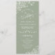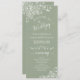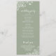 Este belo programa de casamento apresenta uma elegante design com texto branco sobre um fundo verde sábio e caracóis brancos e giros nos cantos. Os títulos são escritos em caligrafia de rico, e há espaço para seus detalhes de cerimônia e festa de casamento, assim como um obrigado curto para seus convidados. É uma maneira maravilhosa de dar as boas-vindas aos seus amigos e familiares à sua celebração de casamento.