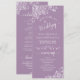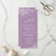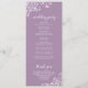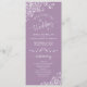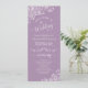 Este belo programa de casamento apresenta uma elegante design com texto branco sobre fundo roxo claro ou lavanda e coalhada branca clara e espirais nos cantos. Os títulos são escritos em caligrafia de rico, e há espaço para seus detalhes de cerimônia e festa de casamento, assim como um obrigado curto para seus convidados. É uma maneira maravilhosa de dar as boas-vindas aos seus amigos e familiares à sua celebração de casamento.