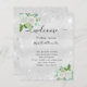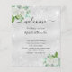 Um fundo metálico de cor prateada falsa, decorado com flores brancas e de cor aquosa, verde de eucalipto e pó de cinza prateada falsa. Personalize e adicione seus nomes e sua linha do dia do casamento.