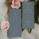 O programa de casamento de folhas mínimas elegante em azul empoeirado é perfeito para um casamento de primavera, verão. O texto pode ser simplesmente personalizado de acordo com as suas necessidades. Você pode encontrar itens correspondentes em nossa loja VelvetPaperCo.