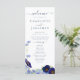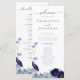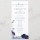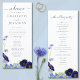O programa de casamento chic boêmio inclui detalhes da cerimônia e o grupo da noiva com modelos fáceis de personalizar, perfeitos para um prado de primavera ou um casamento no jardim de verão. Belas flores silvestres pintadas à mão em aquarela e folhagens em tons de azul rosado, azul centáurea, azul naval, roxo e verde, ideais para um programa de casamento na primavera ou no verão. A tipografia moderna e elegante em azul naval complementa a deslumbrante arte boho caprichosa pintada à mão, que inclui centáureas, papoulas, cosmos, miosótis e folhagens delicadas. Arte original da artista Catherine Sweetman.