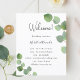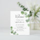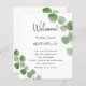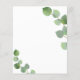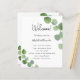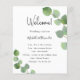 Um programa de casamento moderno e elegante, linha do tempo. Fundo branco, decorado com folhagens de eucalipto, raminhos. Personalize e adicione seus nomes e detalhes do casamento. Letras pretas. Se você tiver mais texto, é possível reduzir o espaçamento entre as linhas e também adicionar texto no verso.