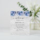 Um programa de casamento moderno e elegante, cronograma. Fundo com aparência de prata falso decorado com brilhos falsos e flores azuis. Personalize e adicione seus nomes e detalhes do casamento. Letras de cor preta. Se você tiver mais texto, é possível reduzir o espaço entre as linhas. Você também pode adicionar texto no verso.