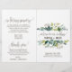 Este programa de casamento com folhagem é perfeito para um casamento rústico. O design apresenta uma moldura boho de folhas verdes e botânicos de folhagem verde. Inclua o nome da noiva e do noivo, a data e local do casamento, mensagem de agradecimento, ordem do serviço, cortejo e um memorial "em memória amorosa".