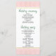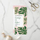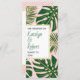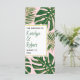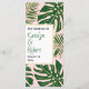 Folhas tropicais verdes e douradas, programa de casamento rosa-pinto. Este design é bonito com folhas de Split Leaf Philodendron (Monstera deliciosa) ou de Queijo Suíço e folhas de palma em verde com contorno de ouro. A sua redação está num quadro branco com contorno dourado. A parte traseira exibe um padrão de bolinhas dourado sobre fundo cor-de-rosa pincelado.