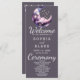 Apresentando nosso programa de casamento noturno, um complemento cativante para sua cerimônia de casamento no tema celeste. O programa apresenta uma sofisticada camada de fundo de cinzas de fumaça, colocando o palco para uma maravilhosa e moderna lua azul e roxa. Adorada com nuvens etéreas azuis e roxas, a lua crescente é embelezada com um delicado borrão de estrelas amarelas, douradas e rosa, criando uma obra-prima celeste que expele encanto e mistério. Na parte de trás do programa, você encontrará uma lista de seus estimados membros festas de casamento, cada nome imortalizado em gratidão por seu importante papel no seu dia especial. O texto do programa é meticulosamente apresentado numa combinação harmoniosa de preto e cinza, utilizando principalmente um tipo de letra simples para clareza e facilidade de leitura. As palavras "Bem-vindo", "Cerimônia" e "Festa de casamento" são, elegantemente, escritas em uma fonte decorativa, acrescentando uma camada extra de graça e sofisticação à design. Nosso Programa de Casamento Noturno Encantado é ideal para casais que buscam um tema de casamento que seja verdadeiramente único, celeste e místico. Com sua paleta de cores cósmicas e fontes elegantes de script, este programa não apenas orienta seus convidados, mas também serve como um bem-estar apreciado, capturando o ambiente mágico de uma noite acesa. Mergulhe seu casamento nas maravilhas cósmicas do universo com o Programa Encantado de Casamento Noturno, um testemunho da sua história de amor entre as estrelas.