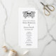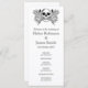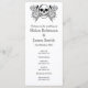 Um design do programa de casamento para combinar com a tatuagem floral do Halloween. Este design monocromático apresenta duas bandas de um padrão floral ilustrado de rosas, teias, aranhas e morcegos e muito espaço para sua ordem de serviço no meio, em uma mistura de fontes pretas elegantes sobre um fundo branco. Isso seria perfeito para um casamento temático de Halloween ou Gótico ou como parte de uma festa de Halloween.